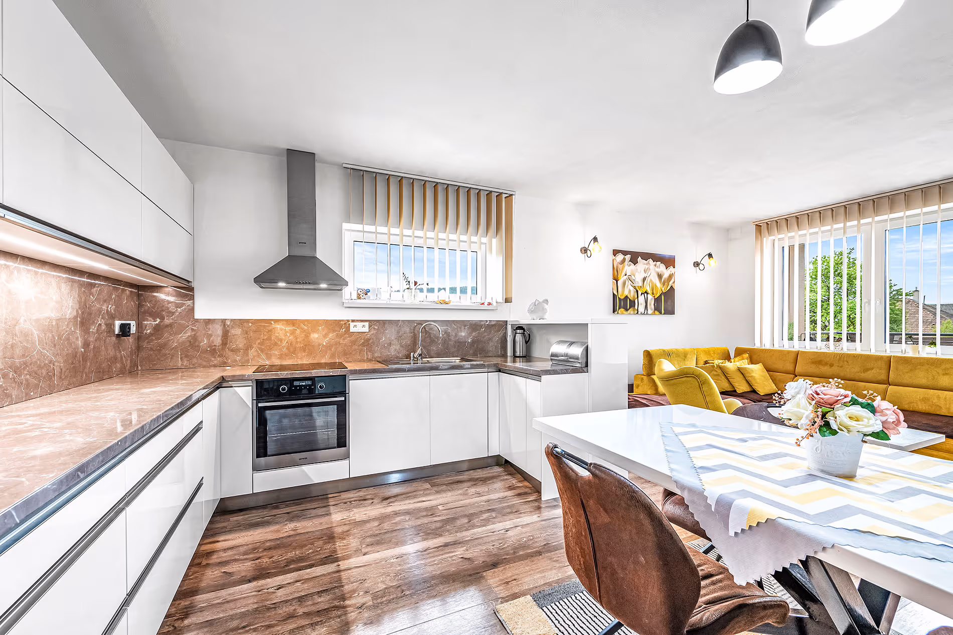 Tento moderný bungalov je navrhnutý tak, aby poskytoval maximálny komfort a úsporu energie. Skladá sa z priestrannej obývacej izby, kuchyne s jedálenským kútom, 3 izieb, 2 kúpeľní, 2 x samostatné WC, technickej miestnosti, špajze, šatníkom a veľkej garáže. Dom je vybavený kvalitnými materiálmi, modernými spotrebičmi a má nízku energetickú náročnosť, čo zabezpečuje nižšie prevádzkové náklady.